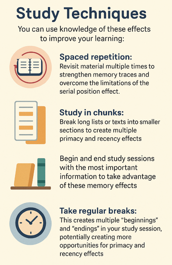 By being aware of these memory phenomena, you can both improve your own learning and better understand how memory influences everyday life. Next time you're trying to remember a shopping list or studying for an exam, think about how you might use the primacy and recency effects to your advantage!