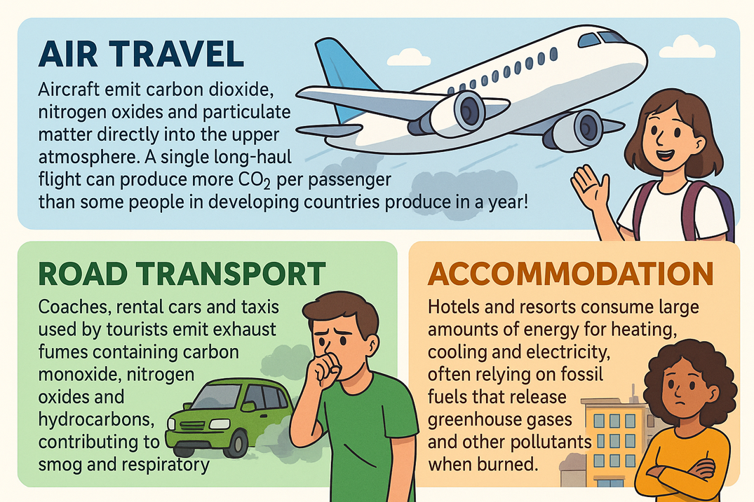 Air pollution is one of the most significant environmental impacts of tourism, primarily due to the transportation methods tourists use to reach and travel within destinations.