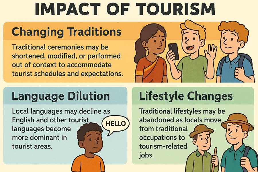 Sacred or significant cultural practices can lose their original meaning when performed primarily for tourist entertainment. Religious ceremonies, traditional dances and cultural rituals may become meaningless performances when taken out of their cultural context.