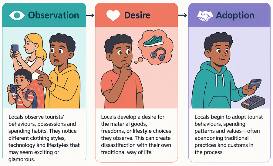 The demonstration effect is particularly noticeable among young people in tourist destinations. As they observe visitors with different lifestyles, clothing, technology and spending habits, they often begin to imitate these behaviours.