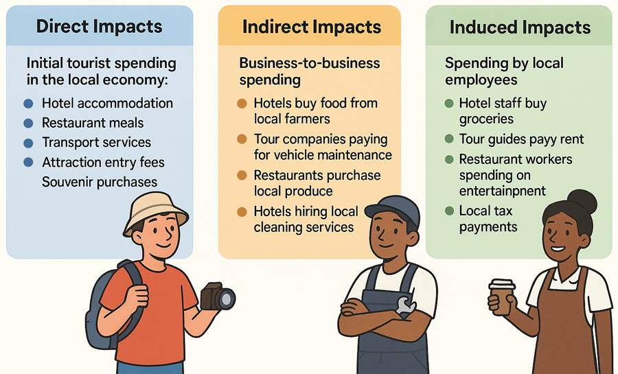 When tourists spend money in a destination, this money doesn't just benefit the businesses they directly pay. It circulates through the local economy in several rounds of spending, creating a multiplier effect.