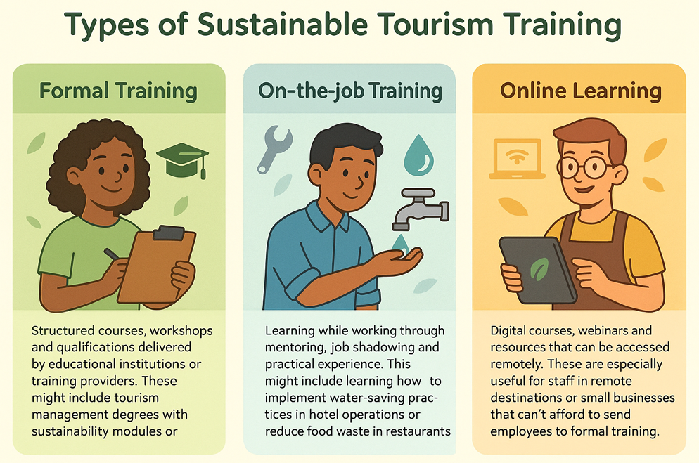 Training should be hands-on and directly relevant to people's jobs. For example, housekeeping staff might practice water-saving cleaning techniques, while tour guides might learn about local conservation projects they can show to tourists.