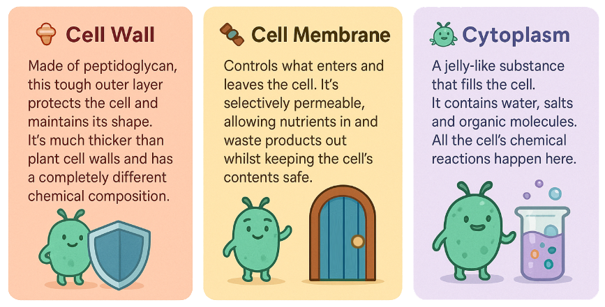 Even though bacterial cells are much simpler than plant or animal cells, they still have several important parts that help them survive and reproduce. Let's explore each component and understand what it does.
