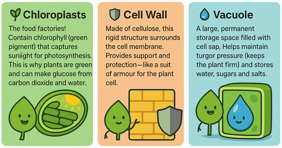 While plant and animal cells share many organelles, plants have some special extras that help them make their own food and stay upright. These differences reflect their different lifestyles!
