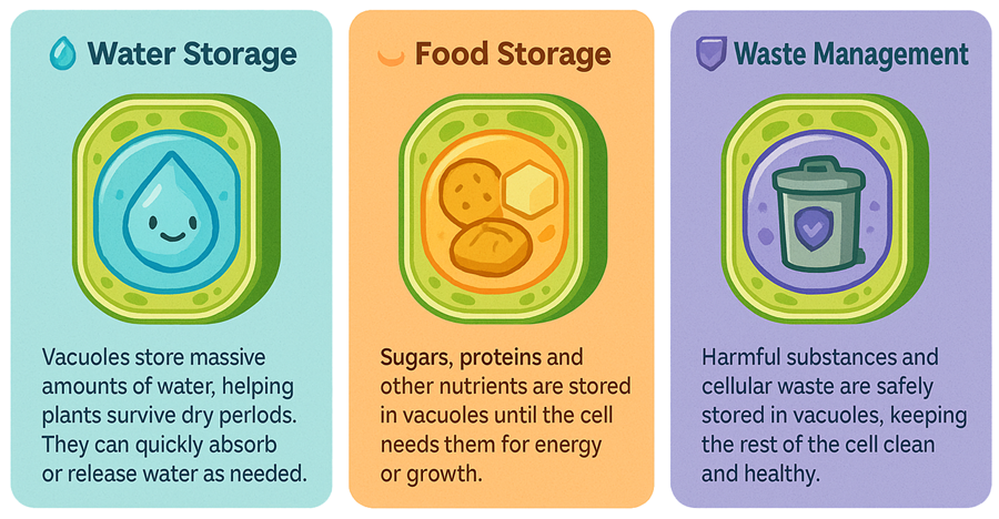 The vacuole is like the plant cell's multi-purpose storage unit. It can take up to 90% of the cell's volume! It stores water, dissolved sugars, salts and even waste products. When full of water, it pushes against the cell wall, creating turgor pressure that keeps the plant upright and firm.